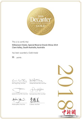 近日, 在世界权威葡萄酒杂志《Decanter》主办的2018年Decanter亚洲葡萄酒大赛(DAWA),张裕公司旗下澳大利亚歌浓酒庄(Kilikanoon Estate)2014年份8K特别珍藏设拉子(Special Reserve Oracle Shiraz)以95分的成绩夺得金牌!根据Decanter亚洲葡萄酒大赛(DAWA)的评选标准,金牌佳酿被定义为“一款非常杰出的葡萄酒,拥有极佳的复杂性和风味表现”。
