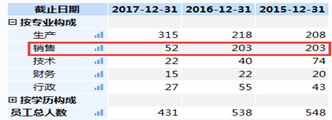 而缩减的人员中主要为销售人员,2015、2016年销售人员达203人,至17年销售人员直接锐减至52人,裁员近151人,裁员率高达7成多。