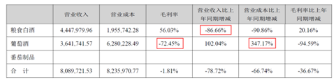 公司的主营业务按产品分类主要为粮食白酒、葡萄酒,以18年半年报最新明细为准,其中葡萄酒业务由于成本激增导致毛利率为-72.45%处于亏本贩卖阶段,这对于急需改善业绩,保净利润正值的公司来说无疑经营压力巨大,因此也不得不迅速剥离。而原有粮食白酒业务销量大幅下滑,导致营收下滑近9成。
