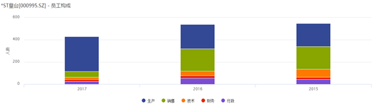 由于持续亏损*ST皇台近几年员工数量也在不断减少,根据公开数据显示,2015年公司尚有548人,2016年共538人,到2017年人员数量缩减至431人,同比减少107人,裁员比率高达20%。
