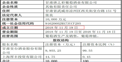 资料显示,唐之彩葡萄酒业为公司与上海厚丰于2018年11月19日合资设立,*ST皇台以实物资产作价22,244.09万元认缴出资9,955.25万元。上海厚丰以现金100万元认缴甘肃出资44.75万元。