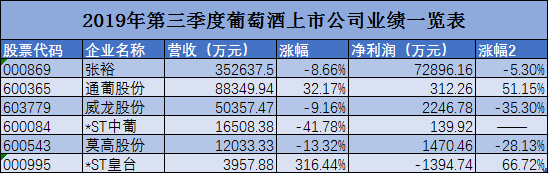 截止10月31日,国内主要葡萄酒上市企业,相继发布了2019年前三季度财报。行业整体虽呈现下滑趋势,但各企业表现不一,亦不乏亮点。