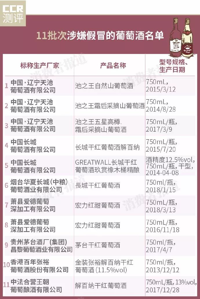 此外,抽检中发现有11批次葡萄酒涉嫌假冒,被假冒的葡萄酒以消费者熟知的品牌为主,包括池之王(3次)、长城(3次)、宏力红(2次)、茅台(1次)、张裕(1次)、王朝(1次),不合格原因多为违规添加甜味剂和人工合成色素,以及防腐剂超标。