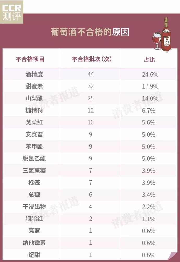 结果显示,近5年来共检出120批次不合格的葡萄酒,涉及酒精度、甜味剂、人工合成色素、防腐剂、品质指标以及标签等问题。