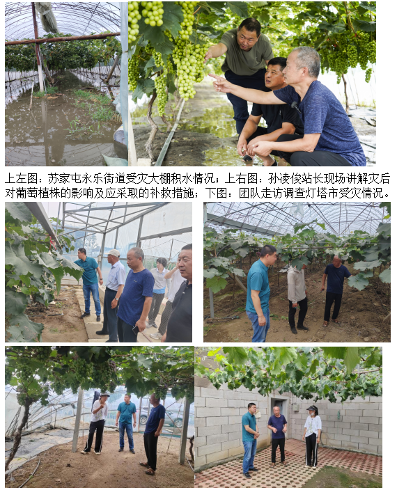 近期,辽宁省因受台风“格美”的影响,辽宁省多地出现持续性强降雨天气,可能对当地葡萄产业造成严重影响,为此,2024年7月30日~8月1日,为应对此次强降雨可能带来的洪涝灾害以及后续发生的次生灾害,熊岳试验站站长孙凌俊研究员带领团队成员先后到受灾最严重的沈阳市苏家屯区及灯塔市、北镇市、盖州市开展灾情调查及灾后应急技术指导工作。