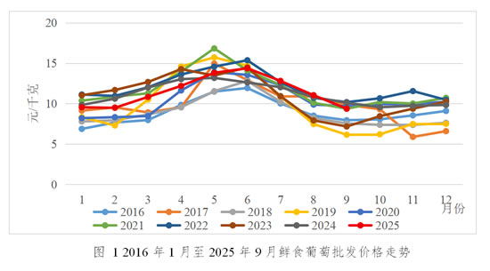 9月鲜食葡萄批发价格均价为9.37元/千克,葡萄批发价格均价较上月(11.04元/千克)下降约1.67元/千克,同比低7.23%,环比低15.13%。从图1的近十年全国鲜食葡萄批发价格走势来看,趋势基本一致,本年9月份批发价格仍处于中等偏上水平。