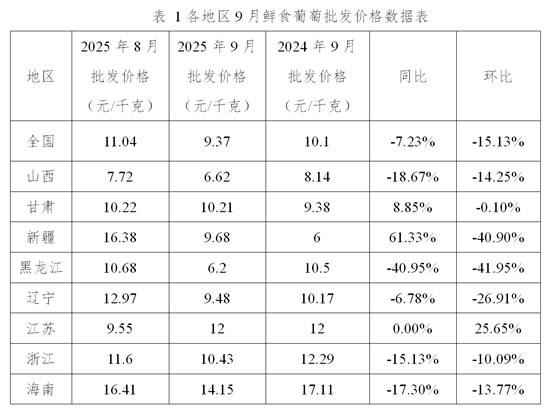 其中,9月最高葡萄批发价是海南,为14.15元/千克,同比低17.3%,环比低13.77%;其次是江苏,为12元/千克,同比保持不变,环比涨25.65%;浙江为10.43元/千克,同比低15.13%,环比低10.09%。其他地区的葡萄批发价格如表1所示。