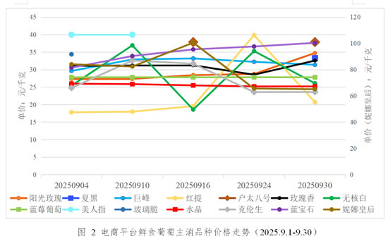 9月1日起,电商平台零售鲜食葡萄品种主要有阳光玫瑰、巨峰、夏黑、玫瑰香等葡萄品种。总体来看,鲜食葡萄价格较上月小幅下降,鲜食葡萄零售价格均价为34.21元/千克,较上月(34.48元/千克)降价约0.27元/千克,除妮娜皇后外,品种之间差异不大。阳光玫瑰、巨峰、蓝宝石位居电商销量前列,妮娜皇后葡萄平均价格显著高于其他品种葡萄,因此价格数据表示在次坐标轴。主要鲜食葡萄零售价格走势如图2所示。