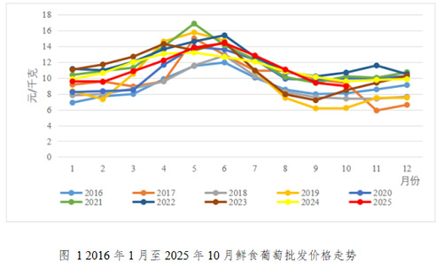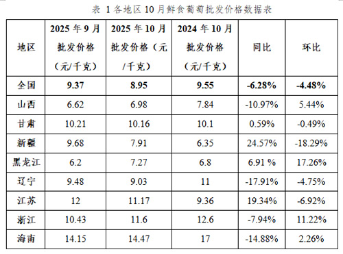 其中,10月最高葡萄批发价是海南,为14.47元/千克,同比低14.88%,环比涨2.26%;其次是浙江,为11.6元/千克,同比低7.94%,环比涨11.22%;江苏为11.17元/千克,同比涨19.34%,环比低6.92%。其他地区的葡萄批发价格如表1所示。