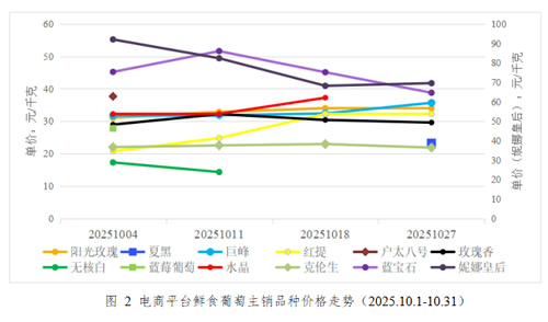 本月,电商平台零售鲜食葡萄品种主要有阳光玫瑰、巨峰、玫瑰香等葡萄品种。总体来看,鲜食葡萄价格较上月轻微上涨,鲜食葡萄零售价格均价为36.08元/千克,较上月(34.21元/千克)涨价约1.87元/千克,除妮娜皇后外,品种之间差异不大。阳光玫瑰、巨峰、蓝宝石位居电商销量前列,妮娜皇后葡萄平均价格明显高于其他品种葡萄,主要鲜食葡萄零售价格走势如图2所示(妮娜皇后价格明显高于其他品种,为了更好的可视化效果,妮娜皇后价格数据显示在次坐标轴)。