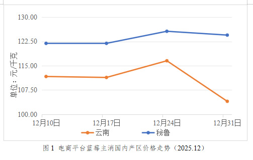 12月份,电商平台零售蓝莓产区主要有云南和秘鲁产区,各产区价格走势如图1所示。整体来看,月初至中旬两地蓝莓价格走势较为接近,均保持相对平稳并在中旬后出现一定回升;进入下旬后,两者价格走势开始分化。具体而言,秘鲁蓝莓价格在月初和中旬基本持平,12 月 24 日左右达到阶段性高点,随后小幅回落并保持相对稳定;云南蓝莓价格在中旬小幅波动后,于 12 月下旬明显上升,但在月底出现较为显著的回落,价格波动幅度明显高于秘鲁蓝莓。总体来看,秘鲁蓝莓整体价格水平始终高于云南蓝莓