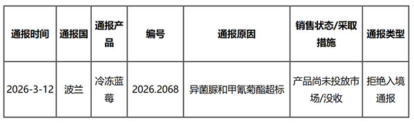 据欧盟食品饲料类快速预警系统(RASFF)消息,2026312日,欧盟通报我国出口冷冻蓝莓不合格。具体通报内容如下: