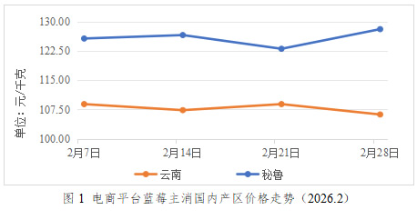 2月份,电商平台零售蓝莓产区主要有云南和秘鲁产区,两地产区价格走势如图1所示。整体来看,秘鲁蓝莓价格继续高位运行,呈现先稳后升的态势;云南蓝莓价格则在区间内小幅震荡。具体而言,秘鲁蓝莓价格在上旬和中旬保持平稳运行,进入下旬后则出现明显上涨,显示出较强的市场支撑力。云南蓝莓价格则在区间内窄幅波动,整体走势平稳,下旬价格有所下降。