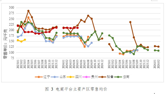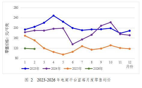 近几年电商平台蓝莓月度零售价格走势比较如图2所示。可以看出,2023年-2026年的月度价格走势整体呈现逐年下降的趋势,尤其是2025年2月起蓝莓价格大幅走低,与前几年同期价格差距巨大。2025年6月起蓝莓价格止跌,但价格水平仍明显低于往年。从年内波动规律来看,2023年价格高峰期在4月份而低谷在11月,2024年高峰在10月份低谷在6月,2025年高峰在1月份而低谷在5月,各年度价格变化规律不明显。